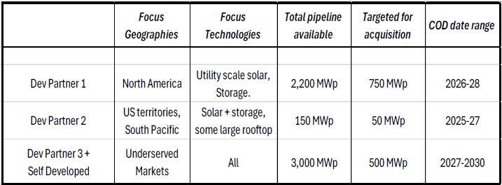 - Once a certain internal milestone is reached (e.g. 500 MW), a strategic long-term infrastructure and IPP partner is brought in.